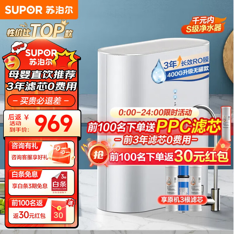 苏泊尔(SUPOR)净水器家用直饮机净水机RO反渗透纯水机400G大通量过滤器DR40滤水器台下软水机厨下厨房净水机价格:998.00元!