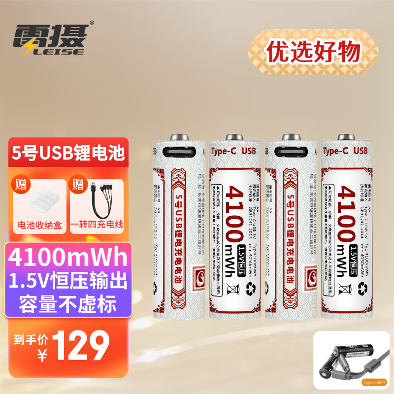 雷摄(LEISE)5号充电电池 USB锂电池 4100mWh(4节) 1.5V恒压 高性能USB-Type-C充电 盒装 适用:无线鼠键/玩具价格:129.00元!