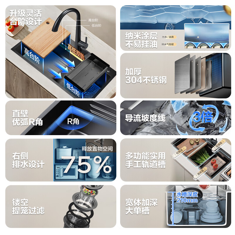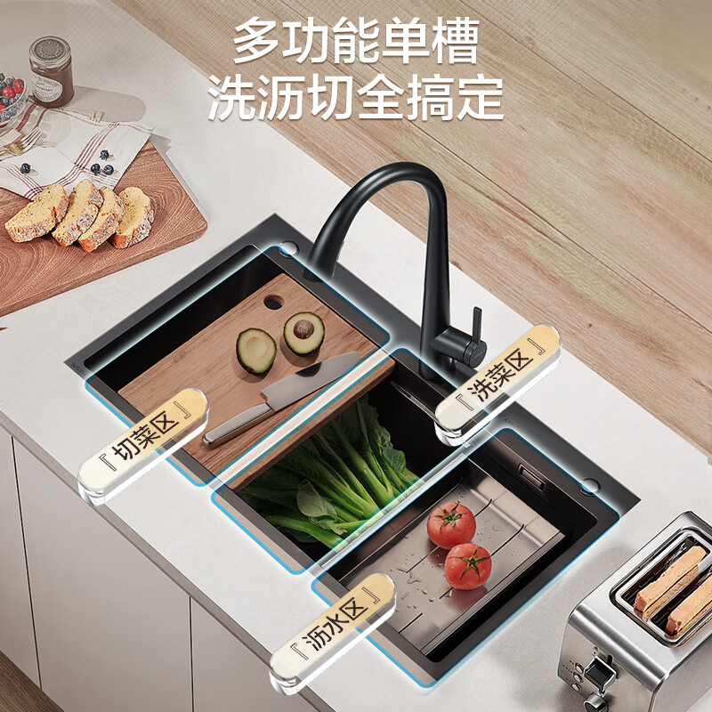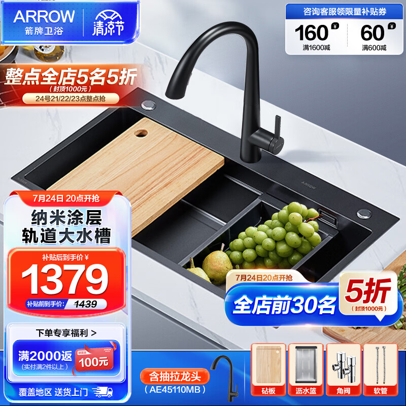 箭牌(ARROW)304不锈钢加厚轨道大单槽厨房洗碗洗菜盆AE5570424G31-NB 纳米黑价格:1519.00元!