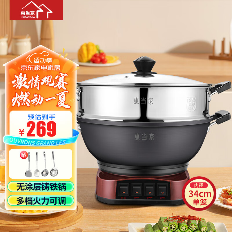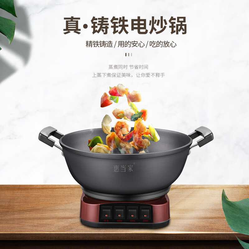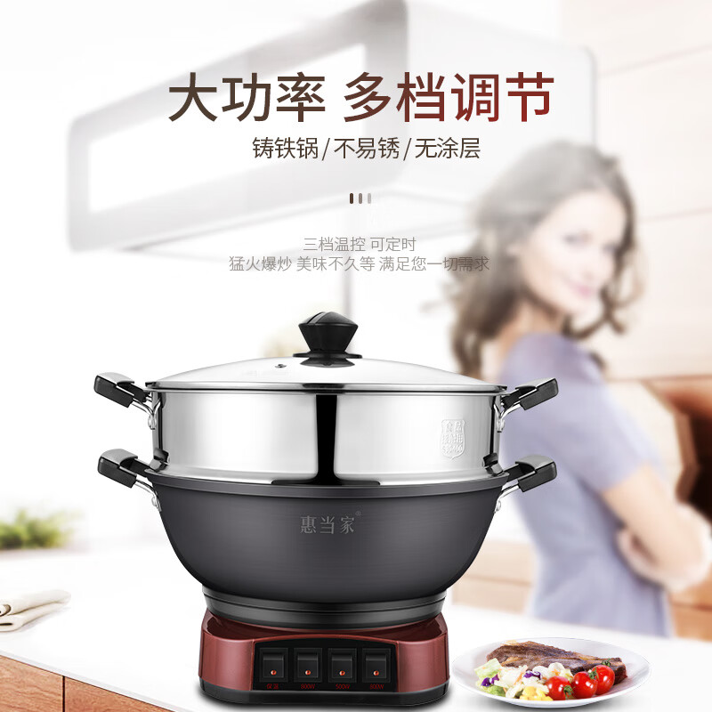 惠当家(Hui Dang Jia)电炒锅多功能电热锅电锅定时电蒸锅一体加厚铸铁锅电煮锅多用途锅 铸铁锅身-34cm单笼【加深按键款】 6.5L价格:288.00元!