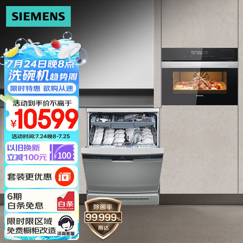 西门子(SIEMENS)洗嵌套装 16套大容量家用洗碗机 智能抽湿烘干+嵌入式蒸烤一体机组合套装 SJ23HI+CS389价格:10599.00元!