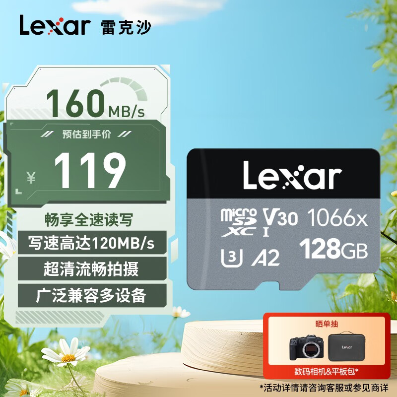雷克沙(Lexar)128GB TF(MicroSD)存储卡 V30 读160MB/s 无人机运动相机内存卡 4K超清(1066x)价格:119.00元!