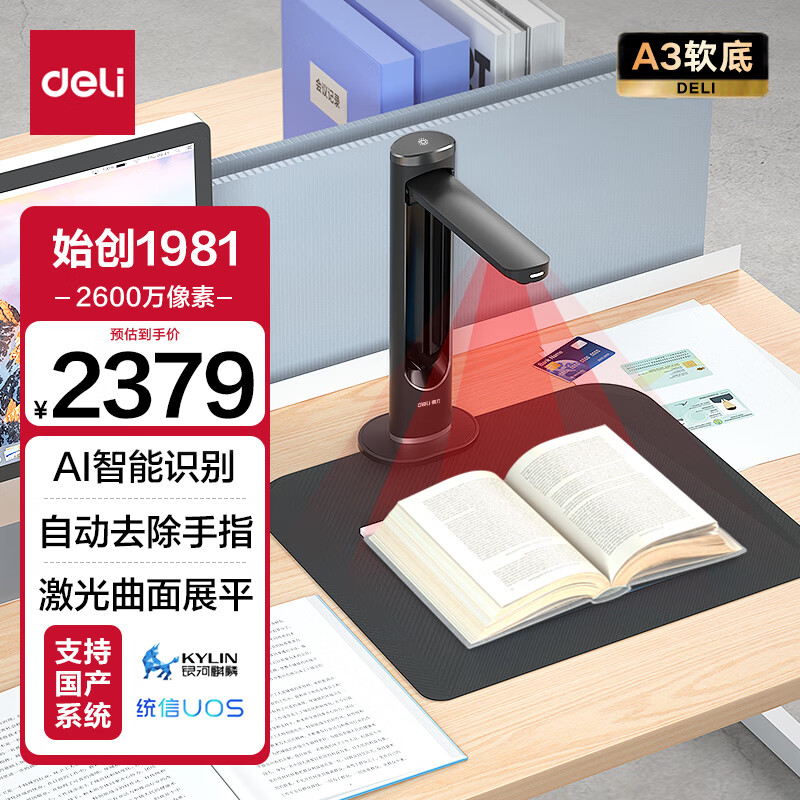 得力扫描仪 2600万像素高拍仪 文件扫描仪连续 视频展台 曲面展平书籍扫描 旗舰版 适配国产系统15165价格:2379.00元!