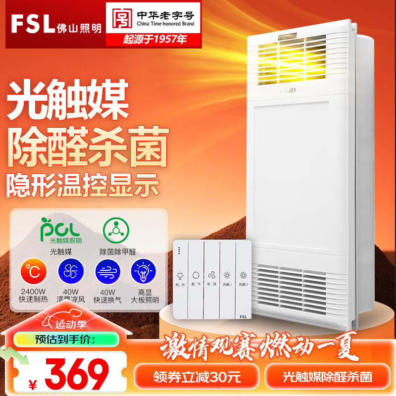 FSL佛山照明浴霸集成吊顶卫生间取暖器加热器换气照明光触媒浴霸T1价格:399.00元!