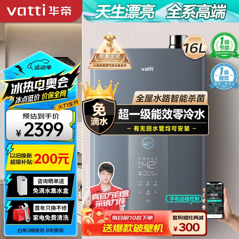 华帝(VATTI)官方16升燃气热水器天然气 超一级能效一级节能冷凝式零冷水免滴水增压瀑布浴 i12254-16 以旧换新价格:2399.00元!