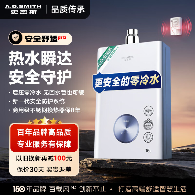 史密斯(A.O.SMITH)佳尼特16升零冷水燃气热水器 不锈钢换热器包8年 负压更 恒温大水量 JSQ31-TJ1 以旧换新价格:3399.00元!