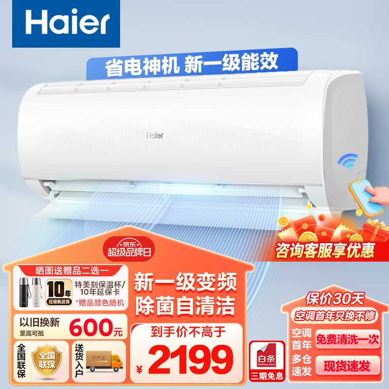 海尔(Haier)大1匹空调挂机壁挂式 新一级能效 变频节能省电 快速冷暖卧室家用 除菌自清洁 智能物联价格:2299.00元!