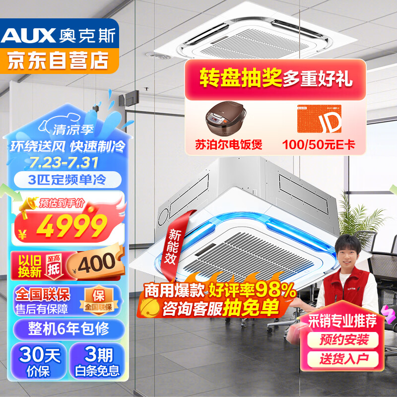 奥克斯(AUX)中央空调一拖一 3匹天花机嵌入式吸顶机单冷新能效吊顶商用天井机220V KF-72QW/R3YC2(B3)厂发价格:4999.00元!
