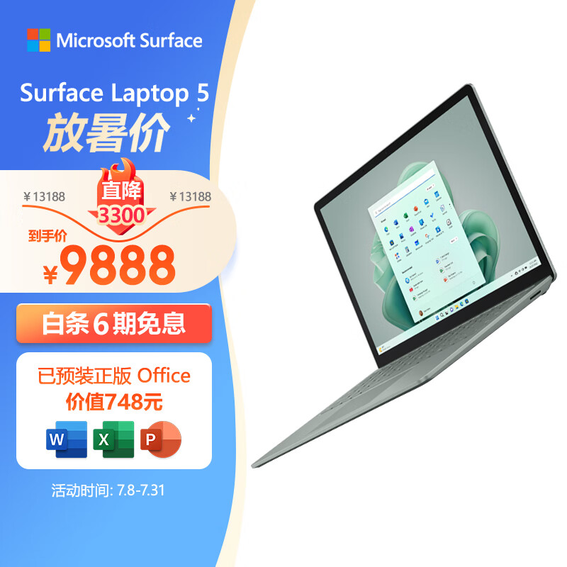 微软Surface Laptop 5 轻薄办公笔记本电脑 i7 16G+512G 仙茶绿 Evo认证 13.5英寸 2.2K高色域触控屏价格:9888.00元!