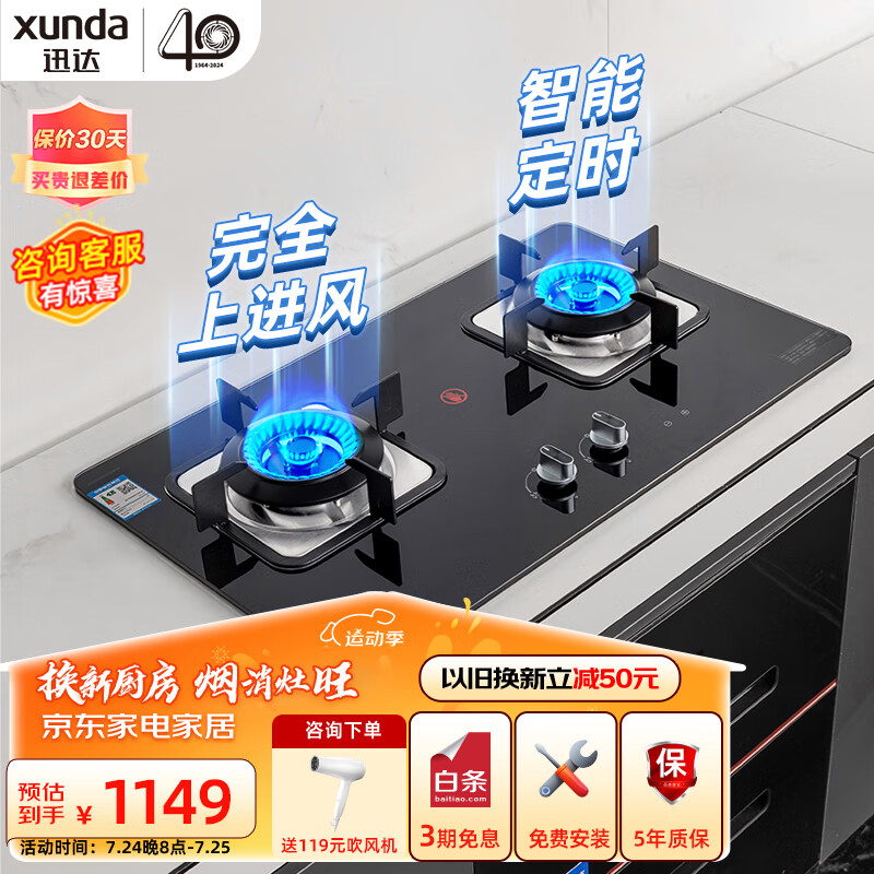 迅达(XUNDA)燃气灶液化气灶家用 煤气灶双灶具 嵌入式台式两用 4.1KW旋流猛火灶 定时可拆卸炉头 F3-液化气价格:1298.00元!