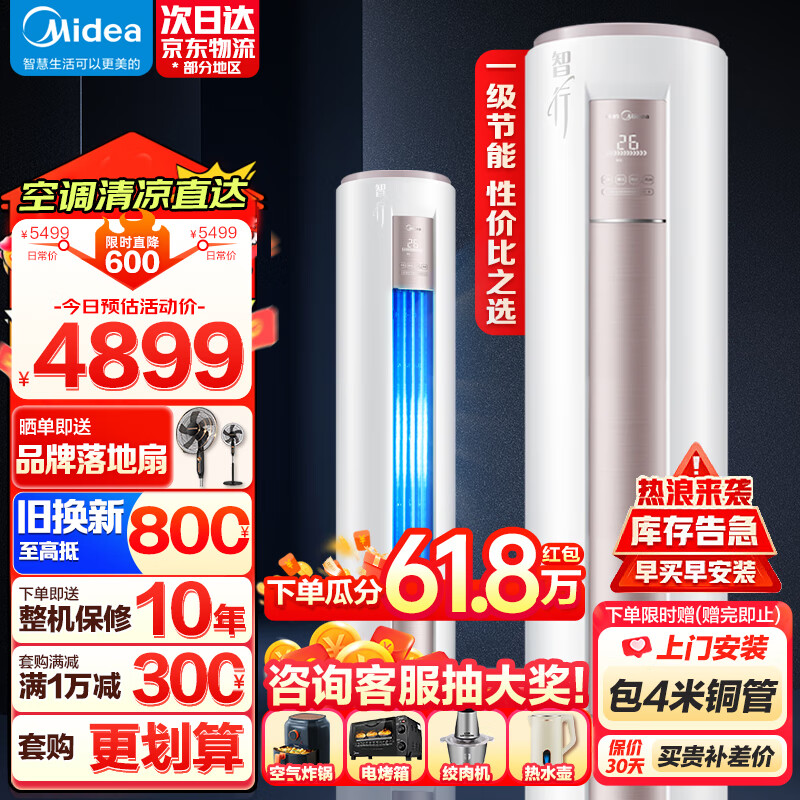 美的(Midea)空调 新一级能效大2匹智行三代自清洁变频冷暖 客厅圆柱空调立式柜机KFR-51LW/BDN8Y-YH200(1)A价格:4899.00元!