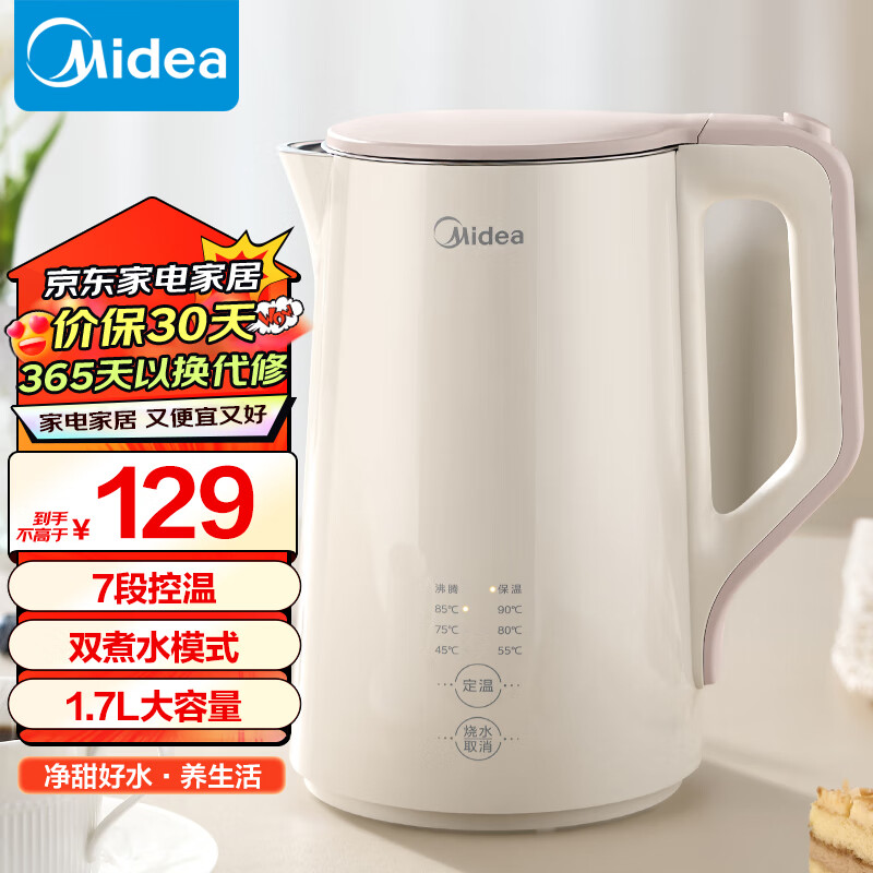 美的(Midea)电热水壶烧水壶1.7L大容量多段控温保温恒温家用开水壶无缝内胆智能自动断电热水壶SHE1732价格:129.00元!