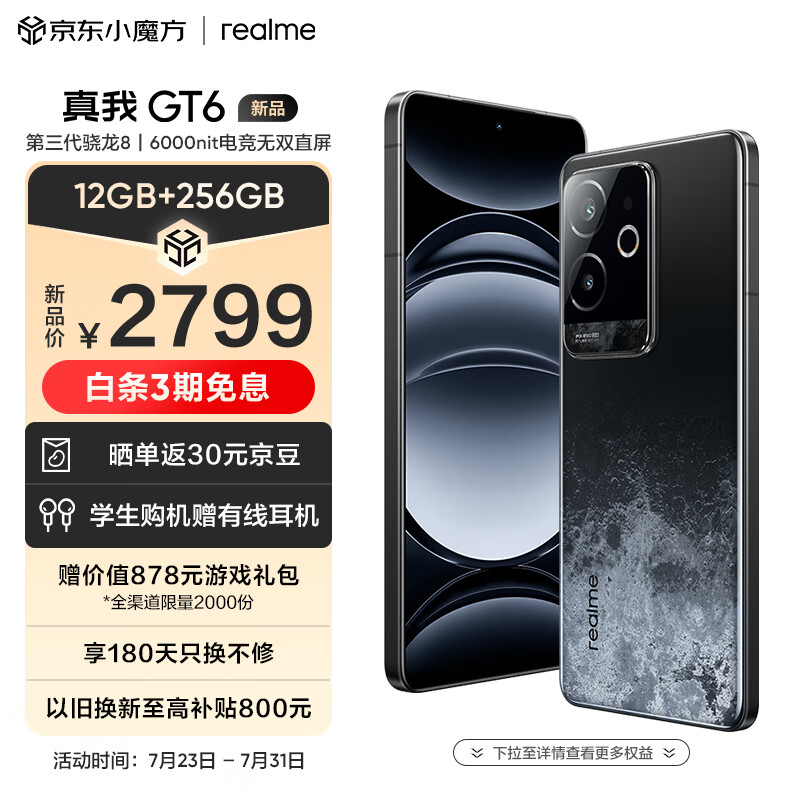 realme真我GT6第三代骁龙8旗舰芯 6000nit无双电竞直屏 5800mAh聚能电池 AI智能游戏手机 12+256月之暗面价格:2799.00元!