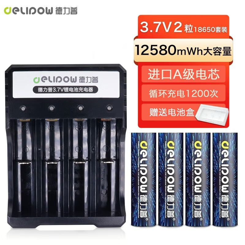 德力普(Delipow) 18650锂电池 3.7v充电电池大容量锂电池充电器强光手电筒专用 平头12580mWh【4槽充电器+4节电池】价格:109.00元!
