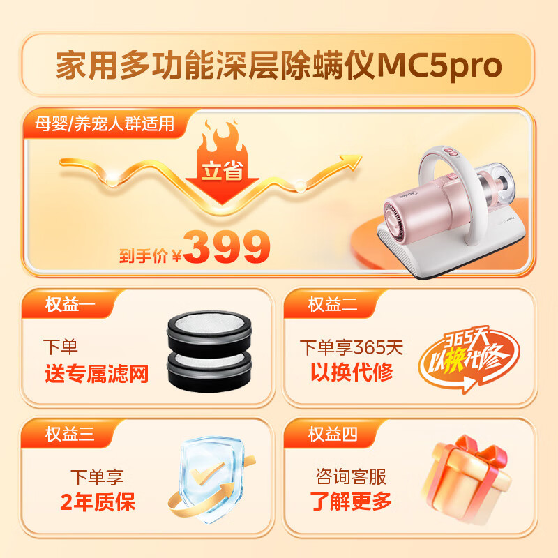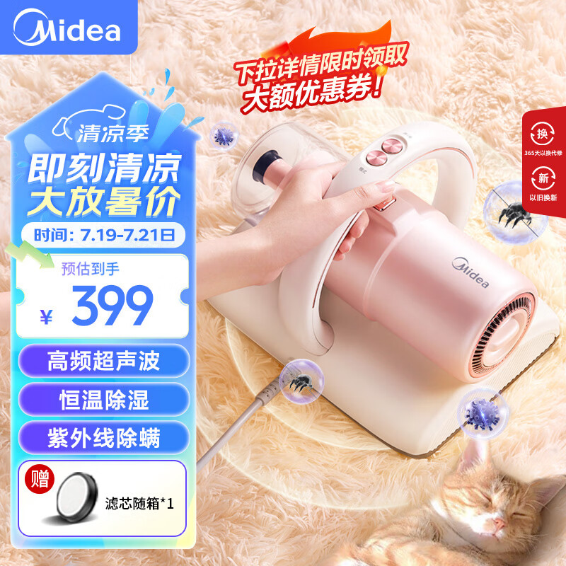 美的(Midea)除螨仪家用床上大吸力手持高频拍打神器 紫外线除螨杀菌尘螨分离去螨虫恒温除湿MC5pro价格:399.00元!