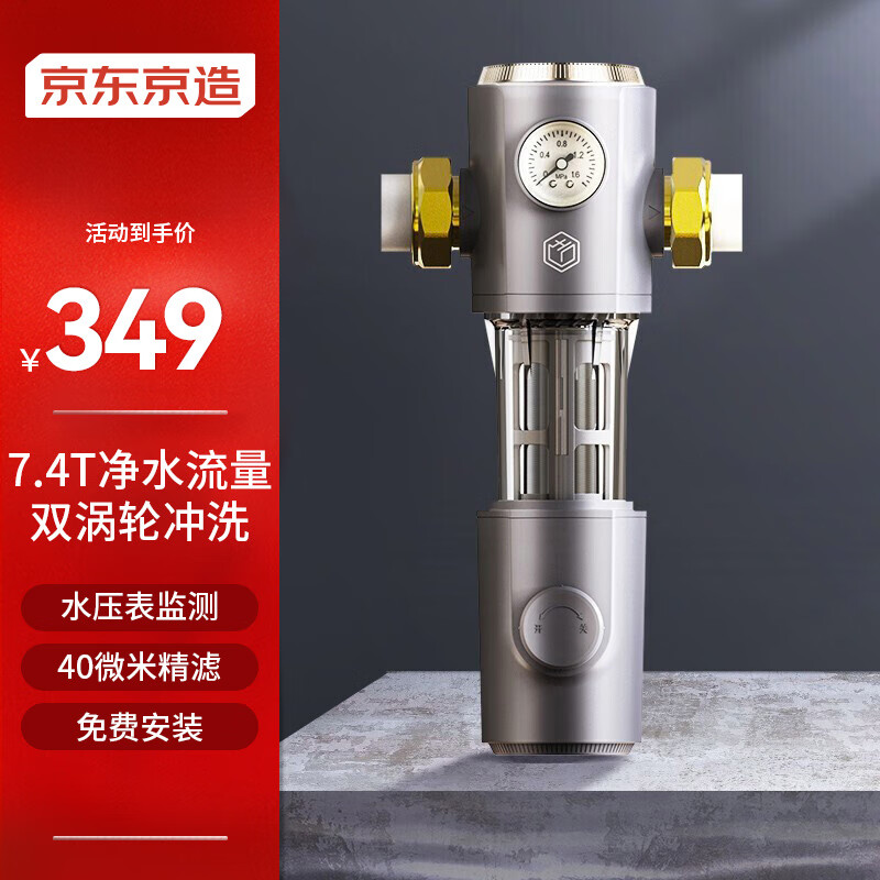 京东京造 前置过滤器 双涡轮正反冲洗 7.4T/h净水流量升级 40微米双滤网精滤水压表监测 免费安装价格:349.00元!