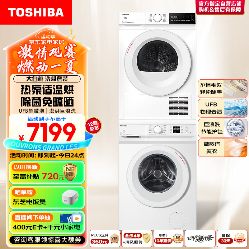 东芝(TOSHIBA)大白桃洗烘套装 DG-10T11B+DH-10T13B 10KG全自动滚筒洗衣机+热泵式变频烘干机除毛絮 以旧换新价格:7199.00元!