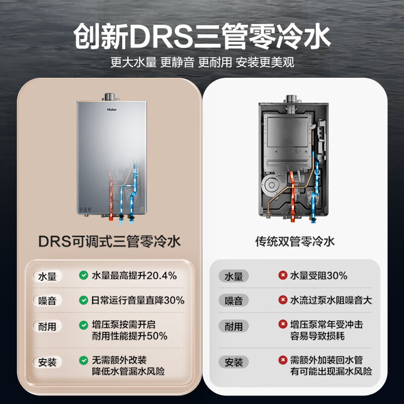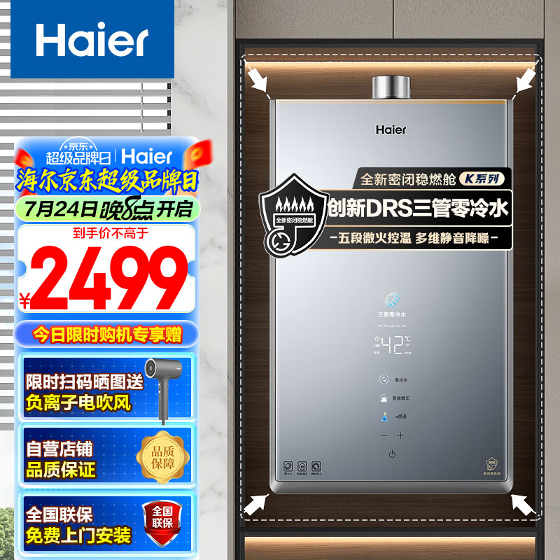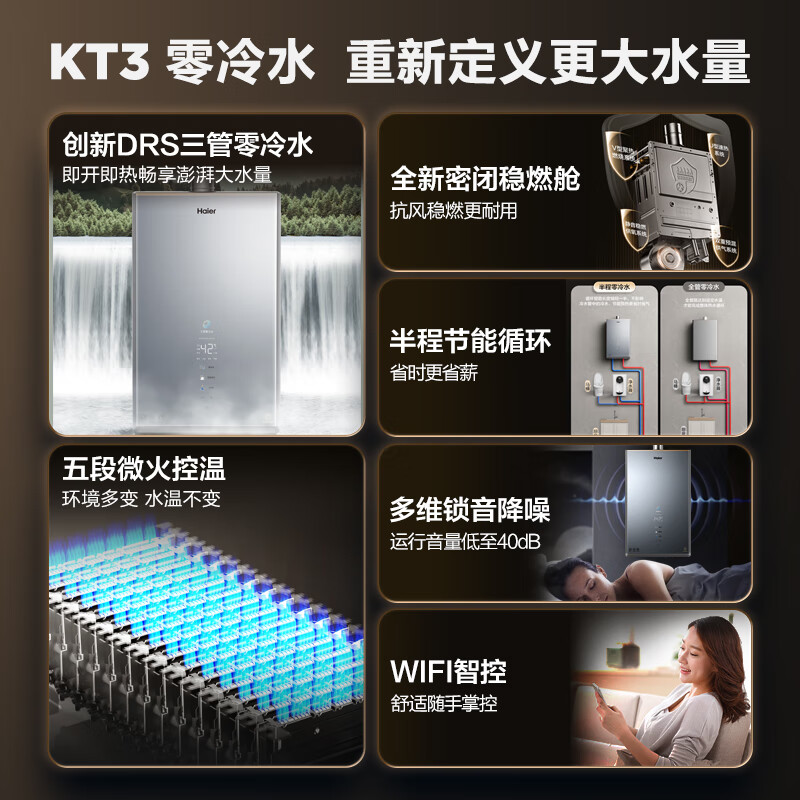 海尔(Haier)16升【K系列KT3】燃气热水器天然气 DRS真三管零冷水 五段微火控温JSQ31-16KT3FRXGU1【以旧换新】价格:2699.00元!