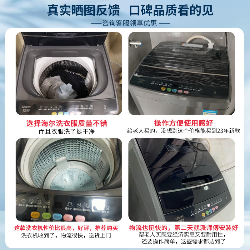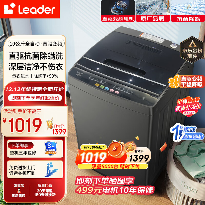 Leader海尔洗衣机全自动10公斤波轮直驱变频一级能效洗衣机家用大容量宿舍租房防缠绕羊毛洗桶自洁价格:1019.00元!