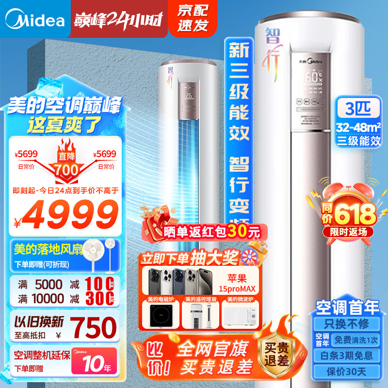 美的(Midea)空调柜机 3匹 智行 变频冷暖 圆柱立柜式空调 客厅以旧换新 KFR-72LW/BDN8Y-YA400(3)A价格:4999.00元!