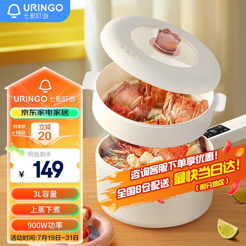 七彩叮当(URINGO)电煮锅 小电锅家用涮锅宿舍小锅电火锅便携式一人食大容量电煮锅3升多功能锅配蒸笼SD04Z价格:149.00元!