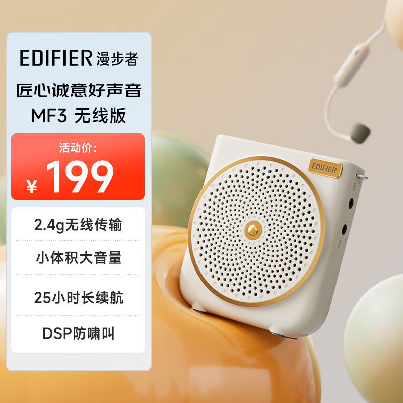 漫步者(EDIFIER)MF3 无线版便携式扩音器 户外音响 小蜜蜂大功率教学专用教师导游会议培训扩音器 云岩白价格:199.00元!