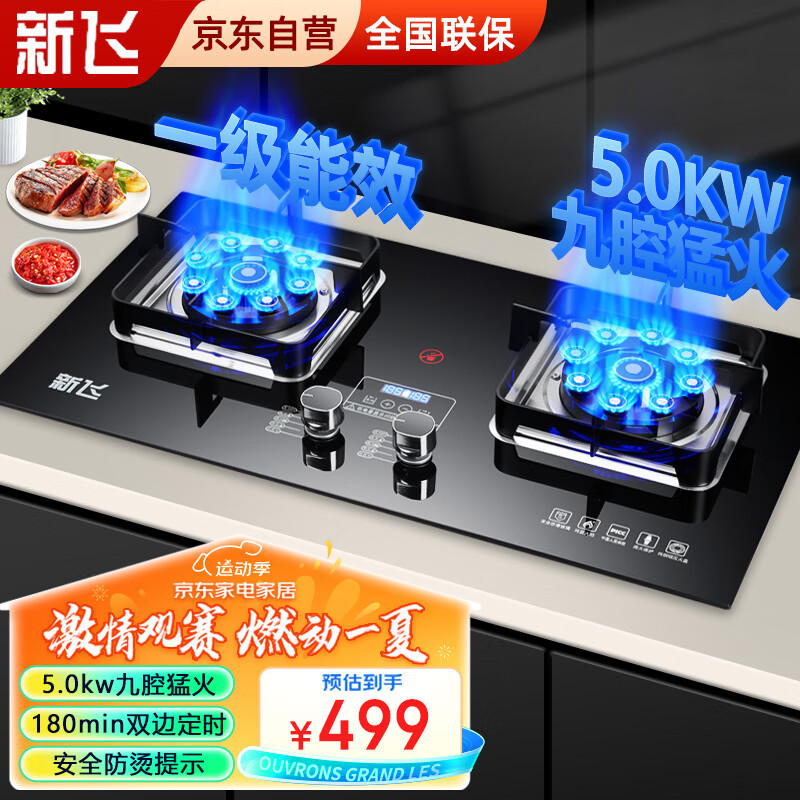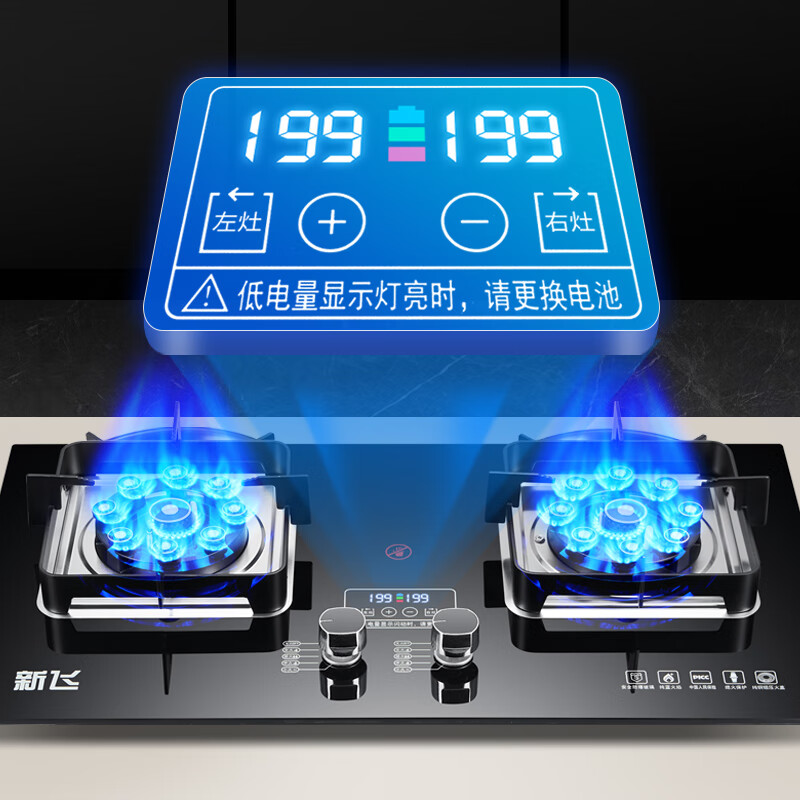 新飞家用燃气灶液化气双灶玻璃方形5.0KW一级能效嵌入式台式煤气猛火定时双九腔纯铜炉具JZY-A6价格:499.00元!