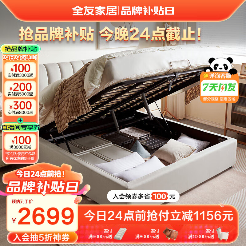 全友家居 床现代简约科技布床双人床卧室储物高箱床1.8米家具105207C价格:3855.71元!