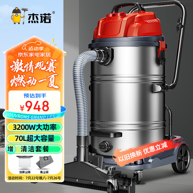 杰诺3200w大功率商用工业吸尘器吸水车间工厂粉尘强力干湿两用70L大容量JN309地刷豪华款价格:1048.00元!