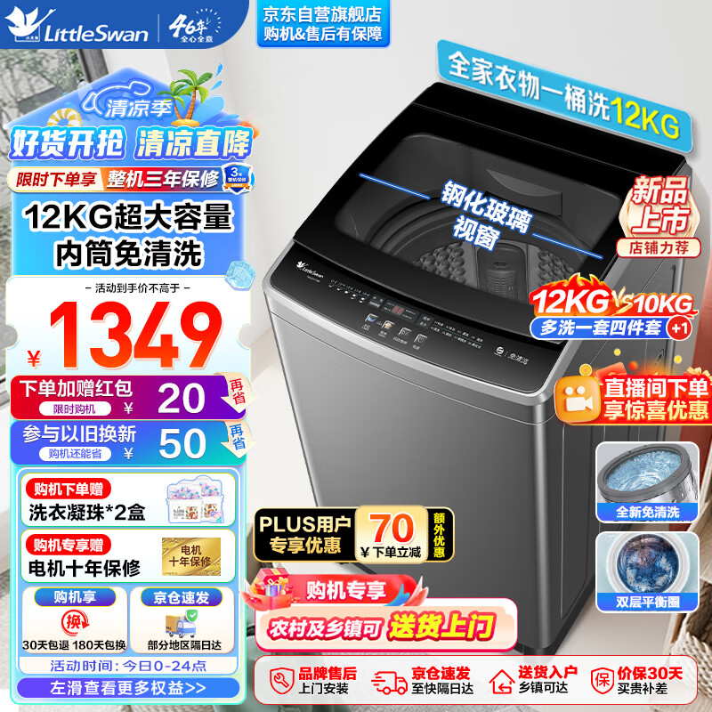 小天鹅(LittleSwan)12公斤大容量全自动波轮洗衣机 家用强劲动力 全新免清洗 钢化玻璃门盖 TB120V728E价格:1349.00元!