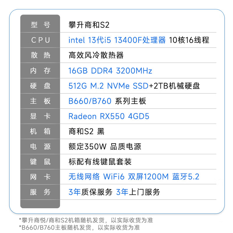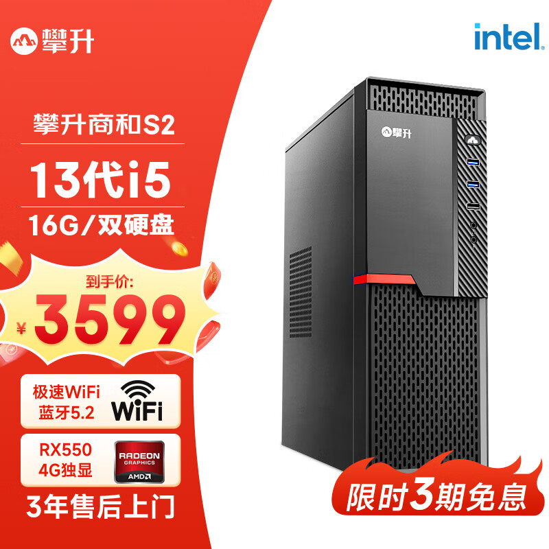 攀升商和S2 设计师办公商用台式电脑(13代i5-13400F 16G 512G+2T 4G独显 WiFi6)单主机全套diy组装机价格:3899.00元!