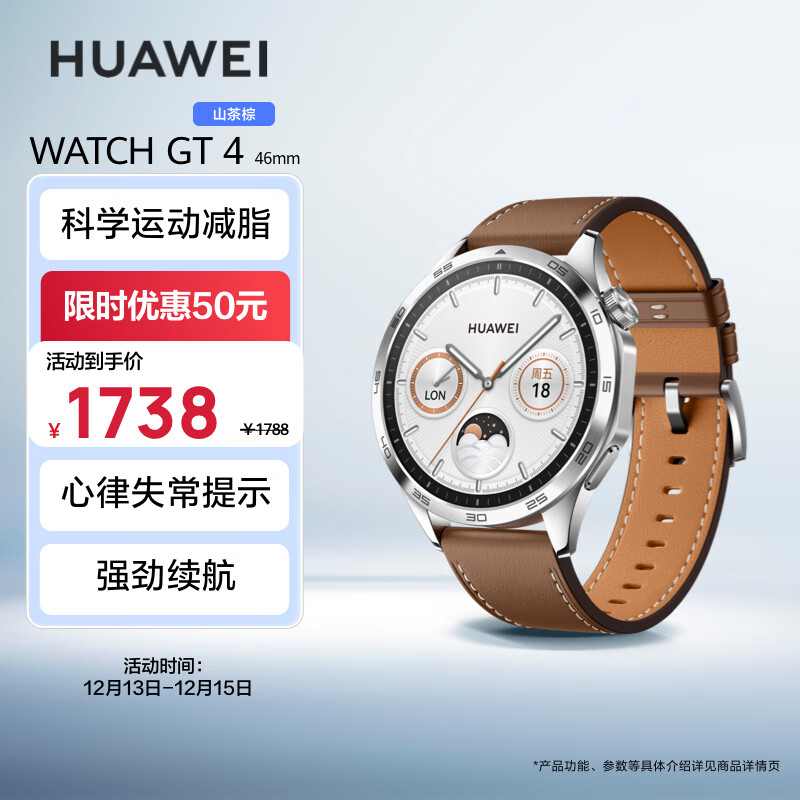 华为 HUAWEI WATCH GT 4 46mm 山茶棕 棕色真皮表带价格:1738.00元!