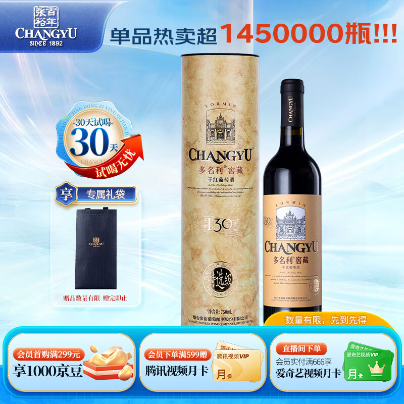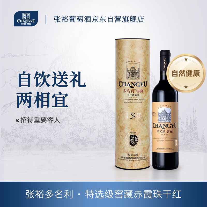 张裕 特选级窖藏赤霞珠干红葡萄酒750ml单瓶圆筒装国产红酒送礼价格:56.00元!