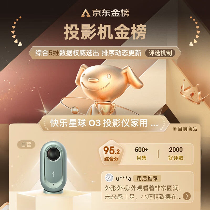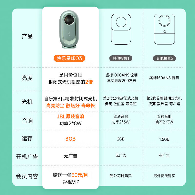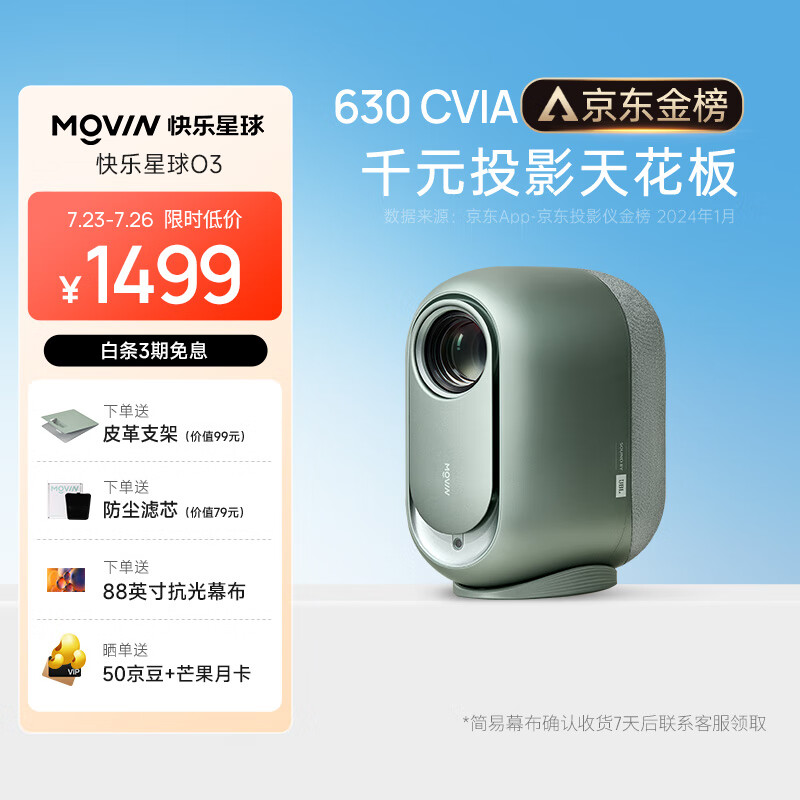 快乐星球 O3 投影仪家用 投影机 智能家庭影院(630CVIA流明 双倍亮度 JBL原装音响 极米系统 3G运存)价格:1499.00元!