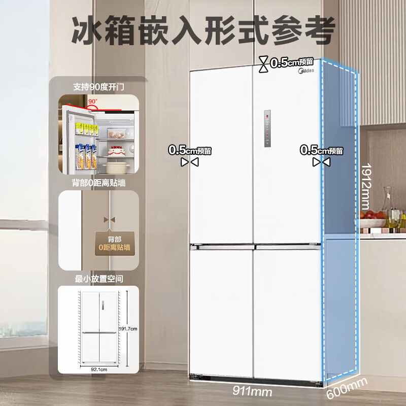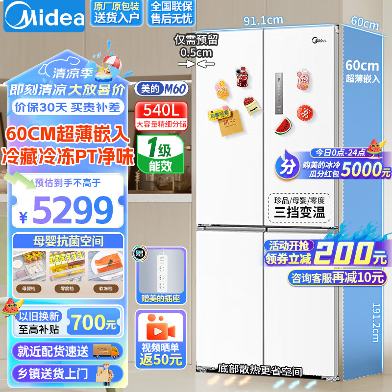 美的(Midea)M60系列540升十字四开门多门风冷无霜超薄零嵌入底部散热一级能效大容量家用电冰箱MR-567WUSPZE价格:5499.00元!