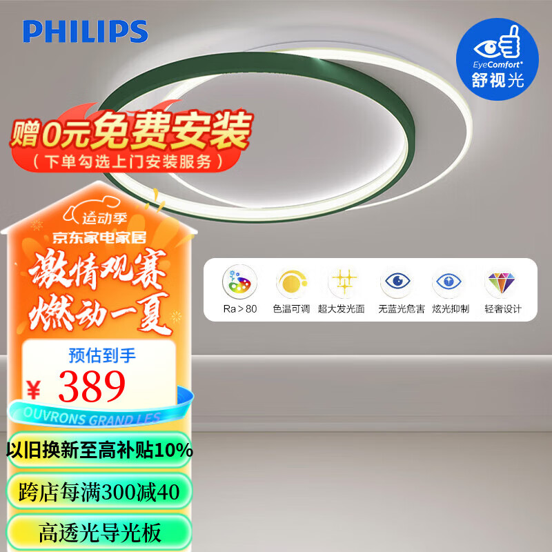 飞利浦(PHILIPS)全光谱LED吸顶灯卧室灯客厅灯书房儿童房灯饰灯具环慕45W罗勒绿价格:429.00元!