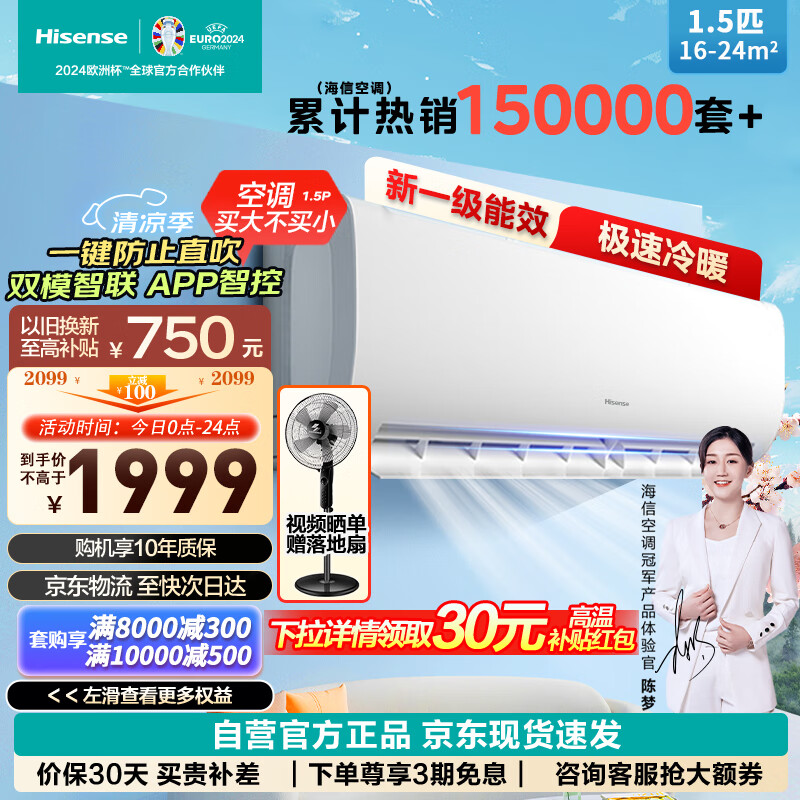 海信(Hisense)1.5匹新一级能效 大风量速冷暖 APP智能变频防直吹壁挂式卧室空调挂机 KFR-35GW/E370-X1以旧换新价格:2099.00元!