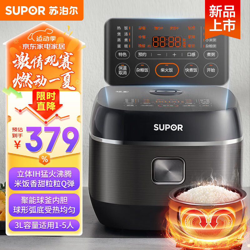 苏泊尔(SUPOR)电饭煲家用3-4个人电饭锅IH加热3L铜晶球釜内胆升级活芯浸泡杂粮饭家用智能电饭煲SF30HC0952价格:399.00元!