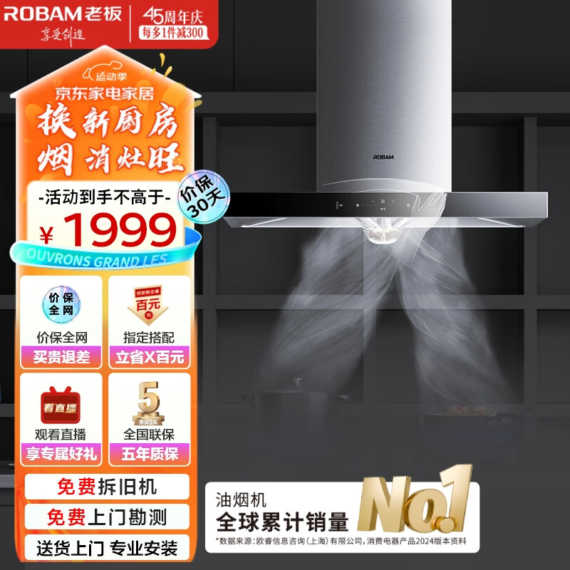 老板(Robam)抽油烟机欧式顶吸式挥手智控脱排油烟机家用20大风量中高层住宅吸油烟机67A1H价格:1999.00元!