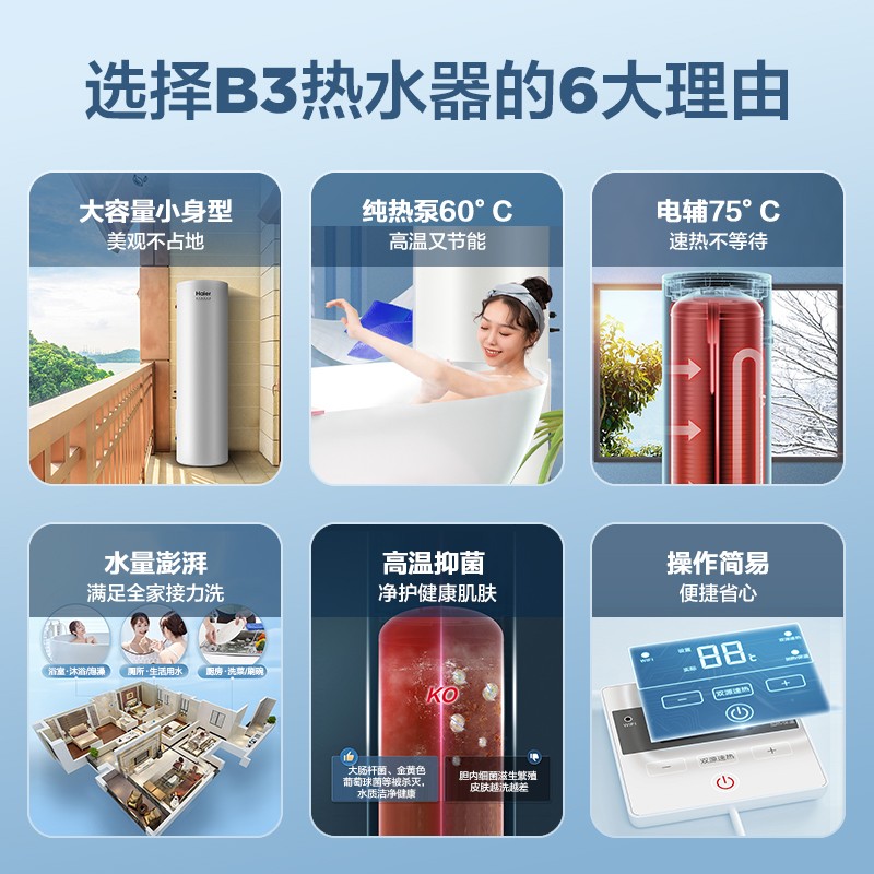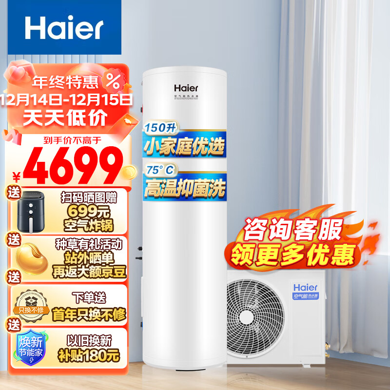 海尔(Haier)空气能热水器150升包安装 75℃高水温杀菌净水洗APP智控电辅 KF70/150-B3-EPU1(小户型优选)价格:4699.00元!