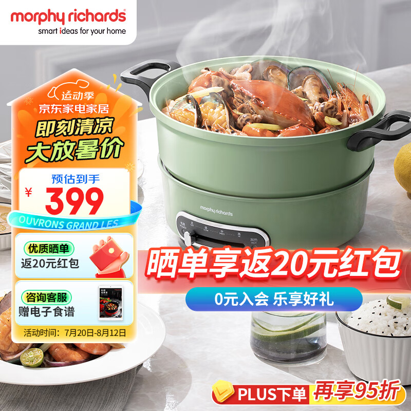 摩飞电器(Morphyrichards)电火锅 家用分体式电煮锅 烤涮一体多功能电炒锅电烧烤料理锅 3L电热火锅锅 MR9087 薄荷绿价格:399.00元!