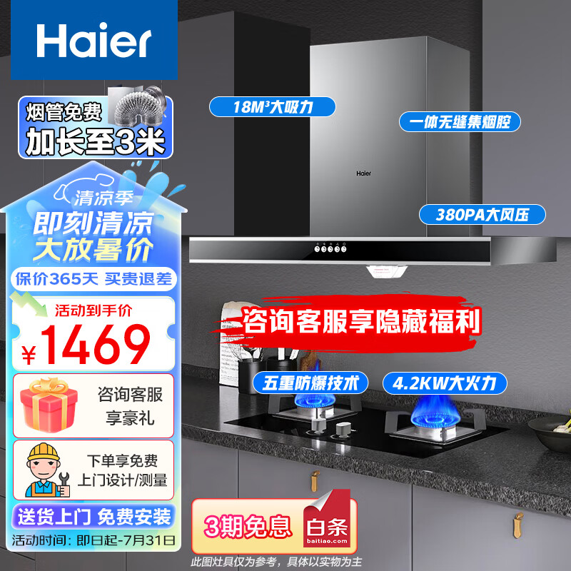 海尔(Haier)抽油烟机燃气灶套装 欧式顶吸一级能效 18m3大吸力吸油烟机家用 E900T6V烟灶套装4.2KW灶[家电]价格:1569.00元!