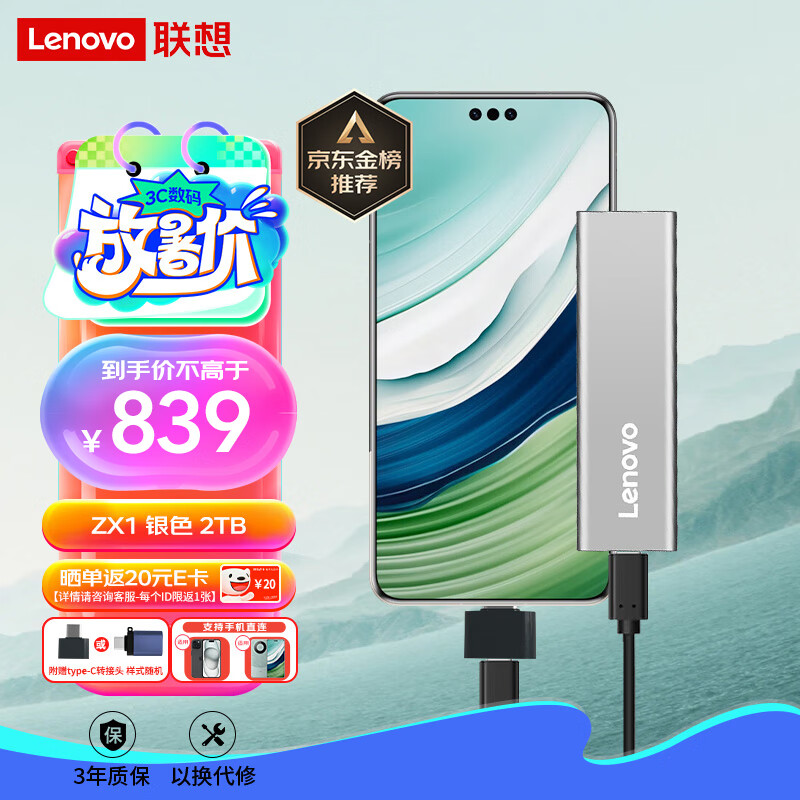 联想(Lenovo)2TB 移动硬盘固态(PSSD) ZX1 Type-c USB3.1双接口 读速560MB/s 手机直连 电脑 银色价格:839.00元!