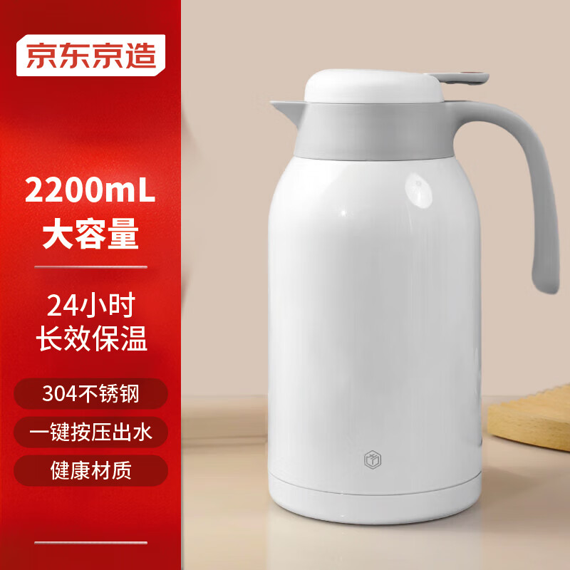 京东京造不锈钢保温瓶家用暖壶按压式热水壶保温壶2.2L白色价格:79.90元!