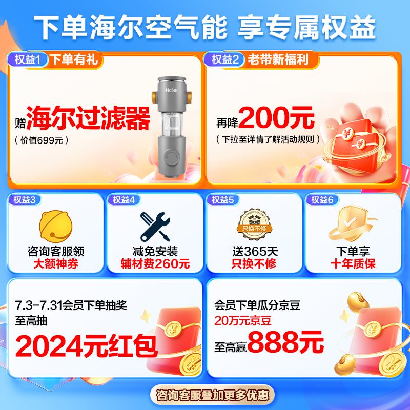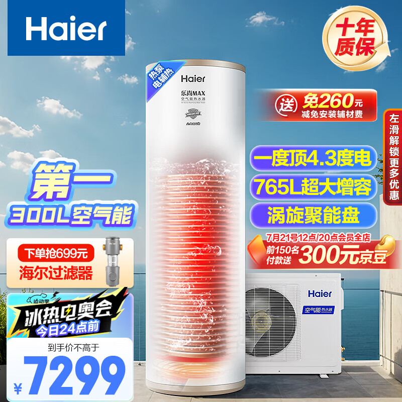 海尔(Haier)空气能热水器300升包安装超一级南北通用电辅80℃净水洗京东小家以旧换新RE-300N5U1(6-10人)价格:7299.00元!