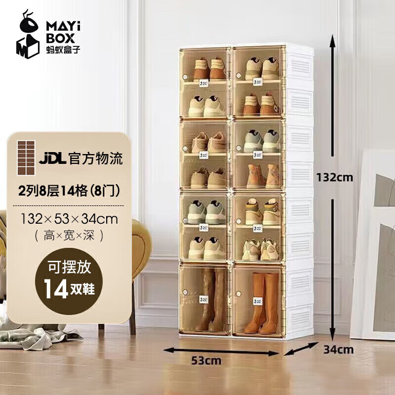 蚂蚁盒子(MAYIHEZI) 免安装可折叠透明茶色塑料鞋柜门口防尘防潮简易鞋盒2列8层14格价格:399.00元!