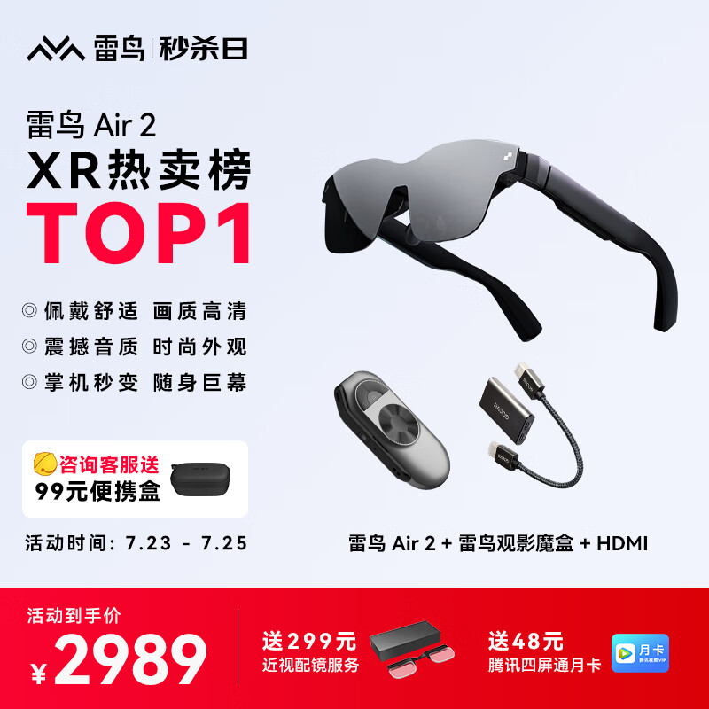 雷鸟Air2 智能AR眼镜 高清巨幕观影眼镜 120Hz高刷 便携XR眼镜 vision pro平替 HDMI转换器+魔盒套装价格:3389.00元!