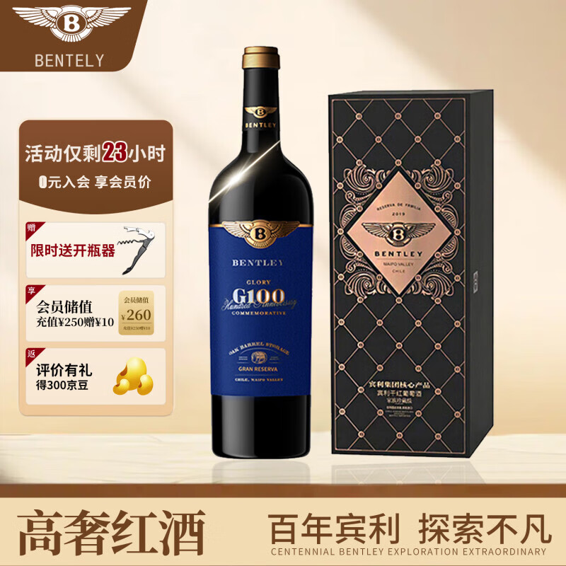 宾利(BENTLEY)红酒智利原瓶进口纪念版干红葡萄酒750ml*1瓶单支送礼红酒礼盒价格:408.00元!