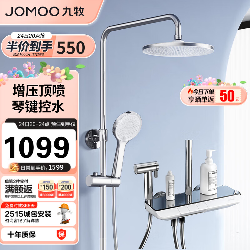 九牧JOMOO花洒全套琴雨钢琴按键升级款双增压顶喷置物36607-536/1B-1价格:1299.00元!