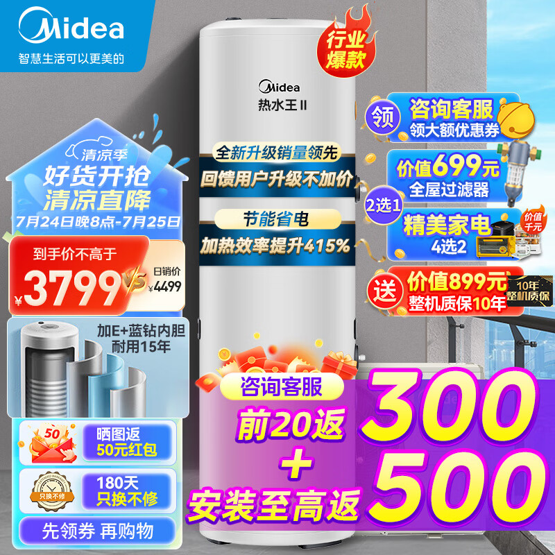 美的(Midea)空气能热水器家用200升包安装热泵升级R32冷媒节能省电热水王二代PLSX-200(33)/N8-B(E2)【京配】价格:4299.00元!